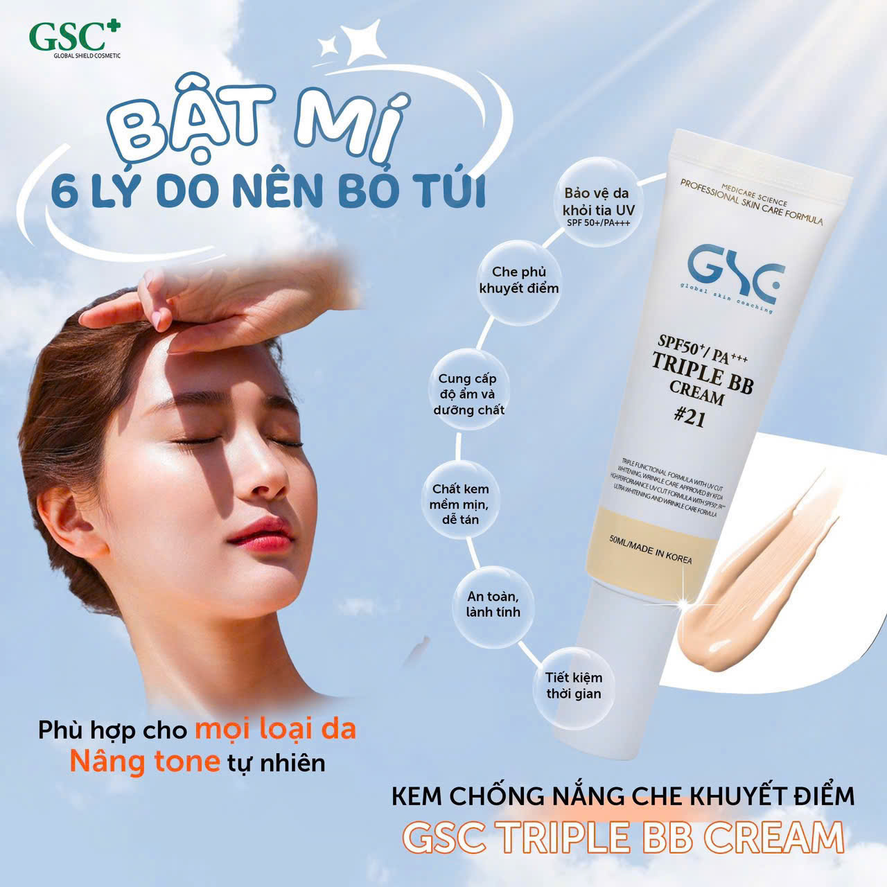 Kem chống nắng BB GSC ( Triple BB Cream) là dòng kem chống nắng phổ rộng, nâng toner đẹp có thể thay thế bằng lớp kem nền mang lại vẻ tự nhiên cho làn da.